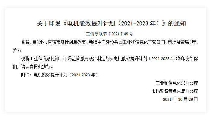 工信部、市場監管總局印發《電機能效提升計劃(2021-2023年)》